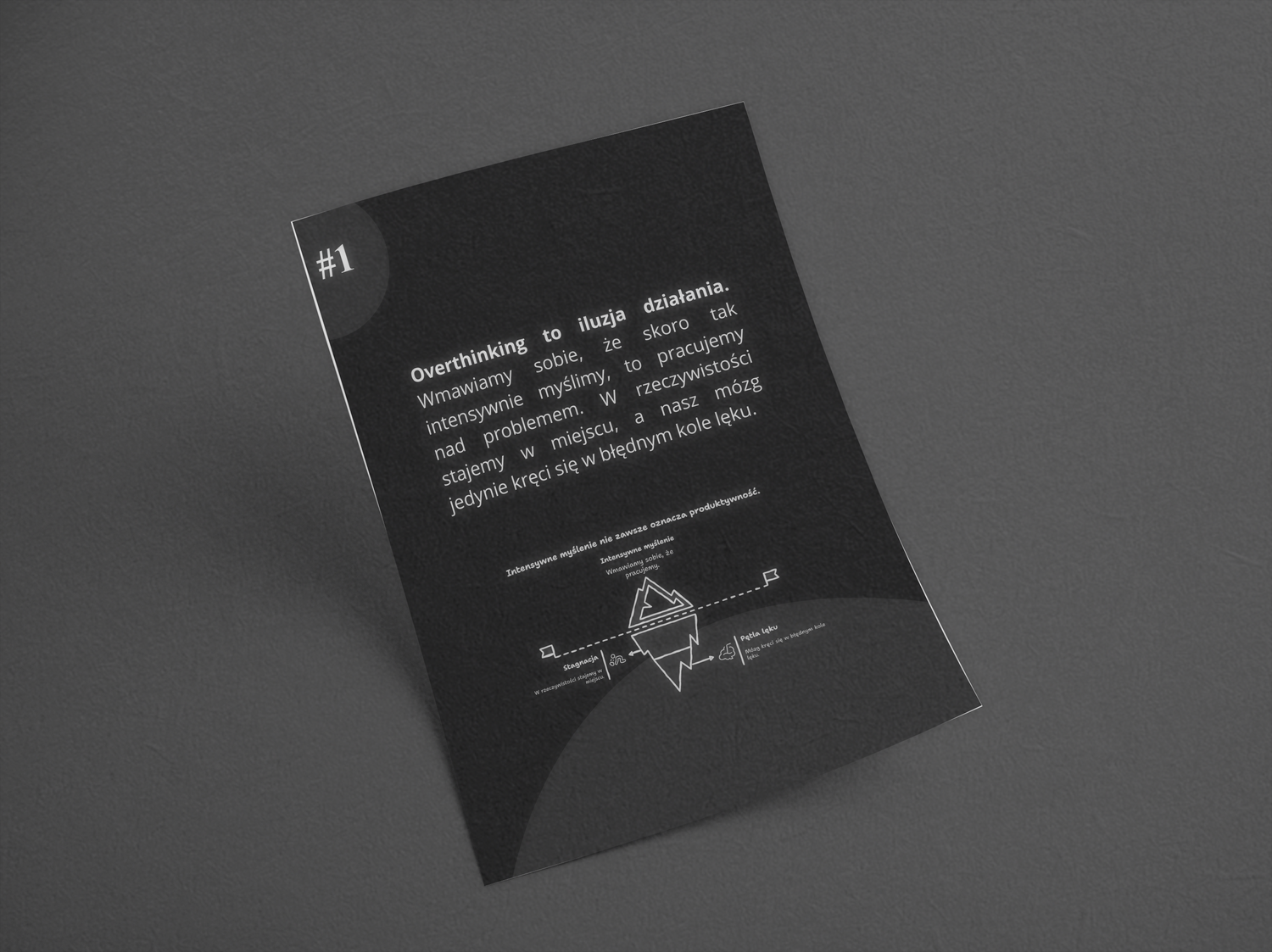 Wszystkie techniki opieramy na solidnych fundamentach psychologii- CBT, ACT i mindfulness. To nie są "wymyślone" porady, tylko sprawdzone narzędzia, które rzeczywiście pomagają wyjść z pułapki overthinkingu. Działają tak samo skutecznie wieczorem, gdy nie możesz zasnąć, jak i w pracy, gdy tracisz koncentrację.